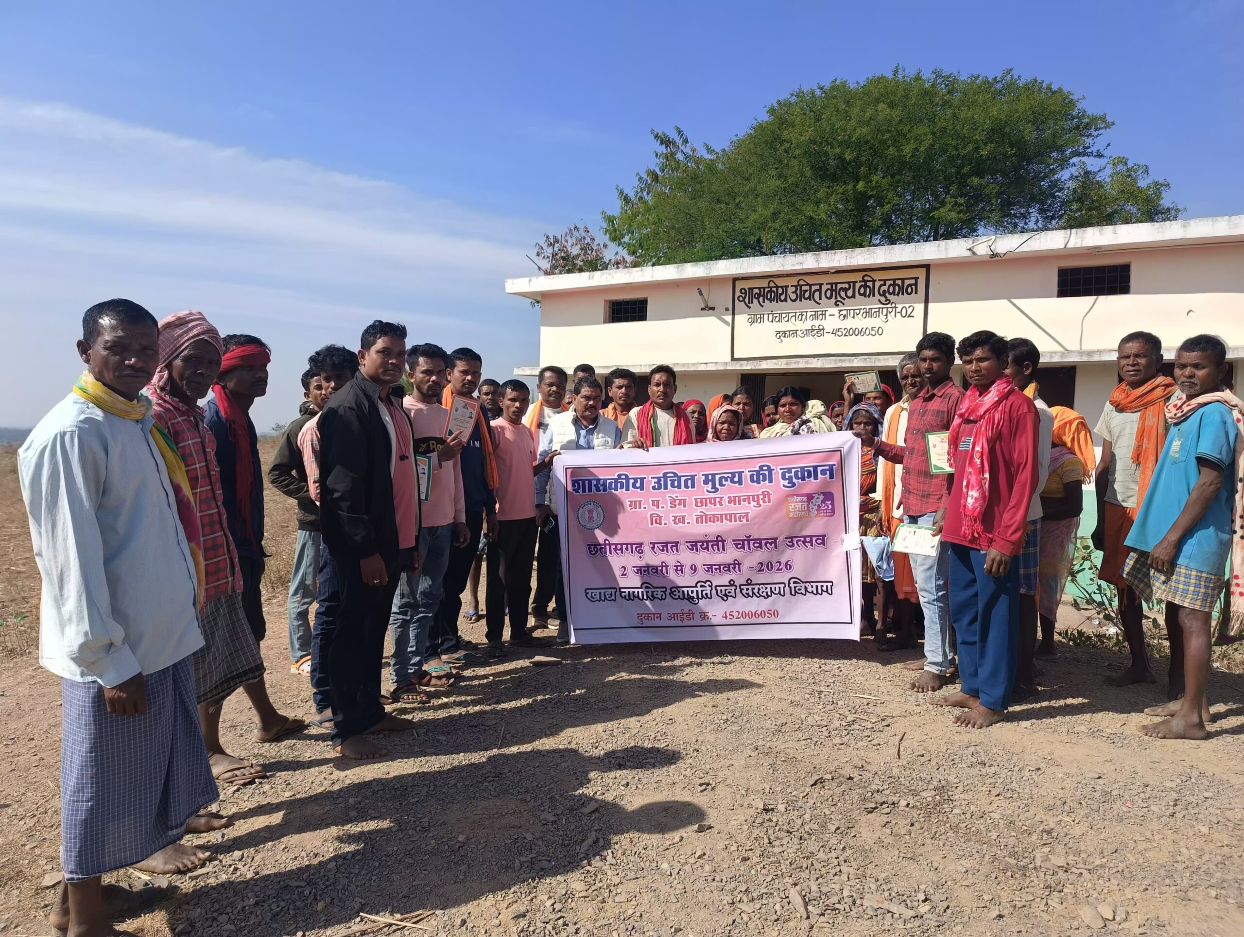 जगदलपुर : बस्तर जिला अंतर्गत ग्राम पंचायत डेंग छापर भानपुरी स्थित शासकीय उचित मूल्य की दुकान में आज छत्तीसगढ़ राज्य के रजत जयंती वर्ष के उपलक्ष्य में “छत्तीसगढ़ रजत जयंती चावल उत्सव” का भव्य आयोजन किया गया। इस अवसर पर क्षेत्रीय विधायक श्री विनायक गोयल ने उपस्थित होकर हितग्राहियों से आत्मीय भेंट की तथा उन्हें चावल वितरण कर कार्यक्रम का शुभारंभ किया।
