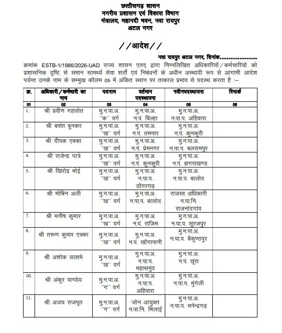 जारी आदेश के अनुसार प्रशासनिक व्यवस्था को अधिक चुस्त-दुरुस्त बनाने और नगरीय निकायों में कार्यप्रणाली को मजबूत करने के उद्देश्य से यह कदम उठाया गया है। इसके तहत राज्य की विभिन्न नगर पालिकाओं और जिला मुख्यालयों में नियमित मुख्य नगर पालिका अधिकारियों (CMO) की नई पदस्थापना की गई है।