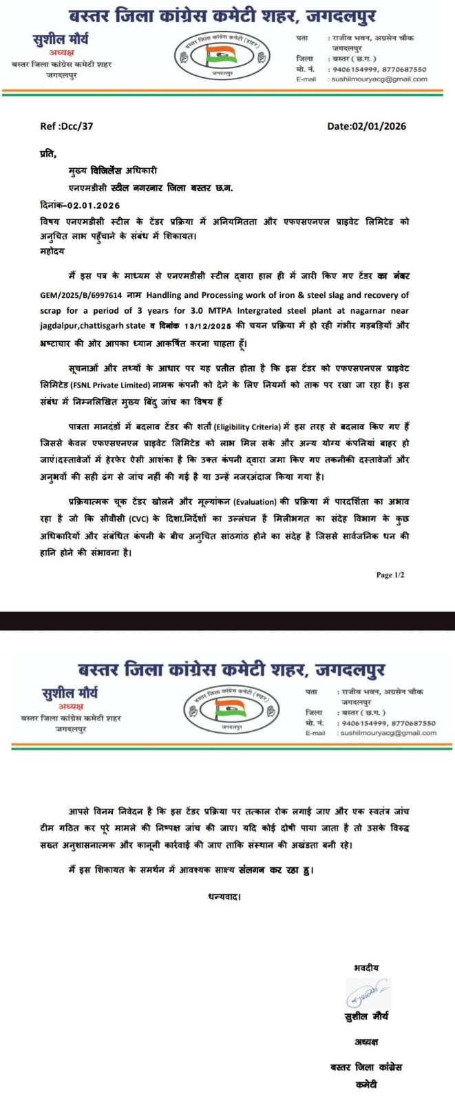 श्री मौर्य ने बताया एनएमडीसी स्टील प्लांट द्वारा हाल ही में जारी किए गए टेंडर का नंबर GEM/2025/8/6997614 नाम Handling and Processing work of iron & steel slag and recovery of scrap for a period of 3 years for 3.0 MTPA Intergrated steel plant. nagarnar near jagdalpur, chattisgarh state दिनाक 13/12/2025 की चयन प्रक्रिया में हो रही गंभीर गड़बड़ियों और भ्रष्टाचार हुई है. सूचनाओं और तथ्यों के आधार पर यह प्रतीत होता है कि इस टेंडर की एफएसएनएल प्राइवेट निमिटेड (F5NL, Private Limited) नामक कंपनी को देने के लिए नियमों को ताक पर रखा जा रहा है।